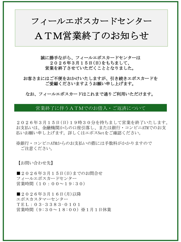 What's New 2026年01月31日(土) UP B1F フィールエポスカードセンター 営業終了のご案内 誠に勝手ながら、フィールエポスカードセンターは 2026年3月15日(日)をもちまして、営業を終了させていただくことになりました。 長らくご愛顧いただき、誠にありがとうございます。 なお、フィールエポスカードはごれまで通りご利用いただけます。 お客様にはご不便をお掛けいたしますが、引き続きエポスカードをご愛顧くださいますようお願い申し上げます。