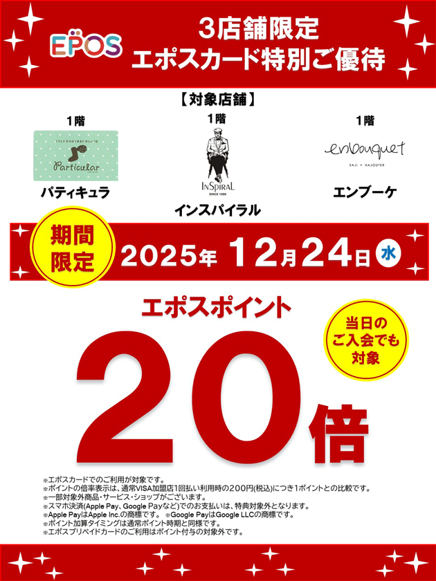 対象3店舗でエポスカードご利用いただくと、エポスポイントが20倍になる特別ご優待を開催いたします。